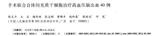 中國(guó)人民解放軍第303醫(yī)院神經(jīng)外科進(jìn)行了手術(shù)聯(lián)合自體間充質(zhì)干細(xì)胞應(yīng)對(duì)高血壓腦出血臨床試驗(yàn),在40例高血壓腦出血受者中,1個(gè)月后,觀察組總有效率(95.0%,顯效30例,有效8例,無效2例)明顯高于對(duì)照組(75.0%,顯效10例、有效20例、無效10例)(P<0.05)。術(shù)后隨訪6個(gè)月,觀察組語言、肌張力和肌力改善情況明顯好于對(duì)照組(語言25vs13例,肌張力20vs12例,肌力23vs10例)(均P<0.05)。
