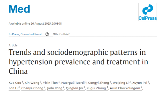 近日,國(guó)內(nèi)一研究團(tuán)隊(duì)在國(guó)際知名醫(yī)學(xué)期刊《Med》發(fā)表了題為《Trends and sociode-mographic patterns in hypertension prevalence and treatment in China》的研究報(bào)告。這項(xiàng)基于全國(guó)代表性大規(guī)模調(diào)查的研究,通過對(duì)比 2012-2015 年和 2021-2022 年兩個(gè)時(shí)間段的數(shù)據(jù),系統(tǒng)分析了中國(guó)成人高血壓的最新流行現(xiàn)狀與管理情況,為制定針對(duì)性的高血壓干預(yù)措施提供了重要科學(xué)依據(jù)。