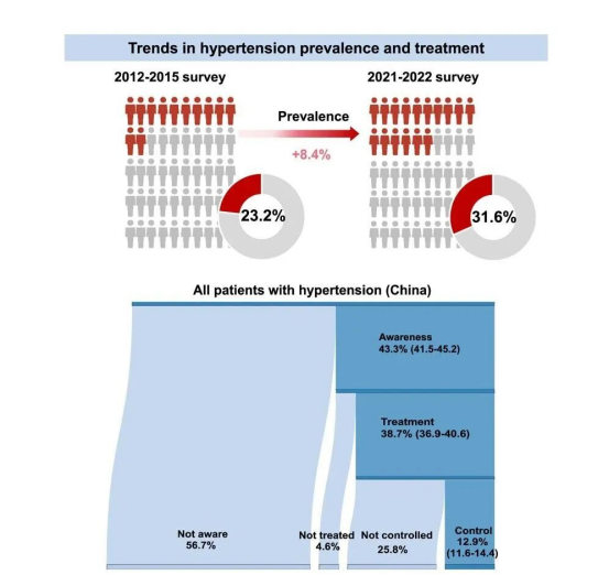 研究數(shù)據(jù)顯示,2021-2022 年中國(guó)成人高血壓患病率已達(dá)到 31.6%,這意味著每三位成年人中就有一位受到高血壓的困擾。與 2012-2015 年的數(shù)據(jù)相比,高血壓患病呈現(xiàn)出明顯的上升態(tài)勢(shì),且這種增長(zhǎng)在不同人群中呈現(xiàn)出獨(dú)特的社會(huì)人口學(xué)模式。