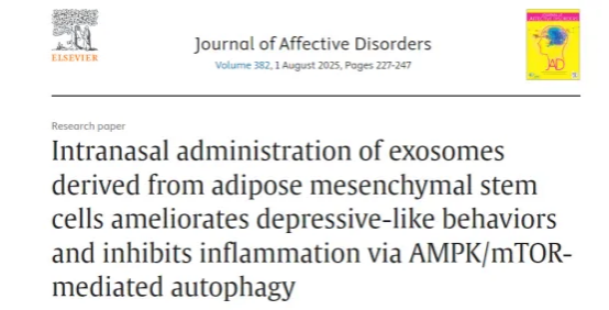 2025年4月,國內(nèi)一研究團隊在國際知名期刊《情感障礙雜志》上發(fā)表了一項令人振奮的研究成果,發(fā)現(xiàn)通過鼻腔給予脂肪間充質(zhì)干細胞(ADSC)來源的外泌體,能夠改善抑郁樣行為并抑制炎癥反應(yīng)。
