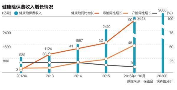 近兩年,隨著人口老齡化加大醫(yī)保資金負擔(dān)越來越重,人社部預(yù)測到22050年3人養(yǎng)一老。在這種背景下商業(yè)健康保險成了重要的補充形式。與產(chǎn)險、壽險相比,商業(yè)健康險的增長飛快。尤其是2013年以來,年復(fù)合增速在40%以上。短短幾年,商業(yè)健康險保費收入就從2012年的863億元,躍升到了2015年的2410億元。而且增長還在繼續(xù)。業(yè)內(nèi)人士表示,若繼續(xù)保持年復(fù)合增長率30%以上的水平,預(yù)計到2020年,商業(yè)健康險保費收入將會超過9000億元。